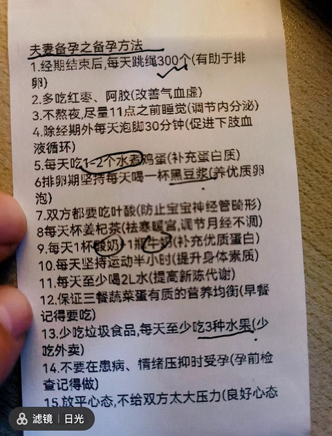 跳绳、泡脚、11点前睡觉……15条夫妻备孕的小方法!这是我看别人分享的,好像是医院医生给打印的,备孕的可以试试看。