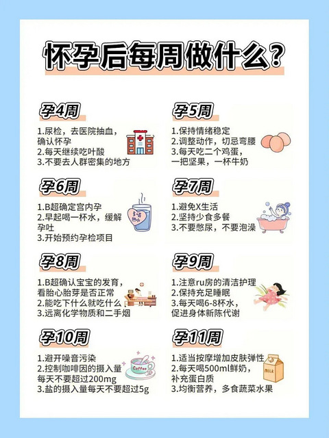 要是当时怀孕时有人告诉我每周该做什么就好了,孕期每周需要做的事和注意点我都总结出来了,希望可以帮助到各位孕期的妈妈们~第4周:抽血检查确定是否怀孕第6周:查孕酮、B超确定是否宫外孕第12周: NT排畸检查,社区医院建档第23周: 三/四维B超检查第26周: 糖筛,预防妊娠期糖尿病第28周: 乙肝抗原检查第32周:定期胎心监护,预防胎宝宝异常第34周: B超预估胎儿体重第37周: 胎位检查第38-4
