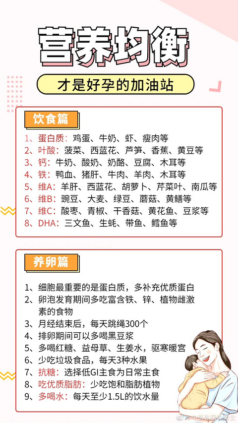 均衡饮食,才是好孕的加油站 认真对待备孕,才是优生优育的关键,想怀孕一个健康活泼的宝宝,女性的日常饮食就需要均衡一点,给大家整理了饮食、养卵的一些侧重点 ?