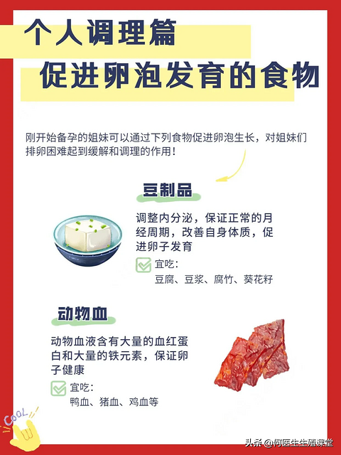 促进卵泡发育的食物有:1、豆制品2、动物血3、海鱼4、黑豆5、谷物6、坚果7、动物内脏8、水鱼汤