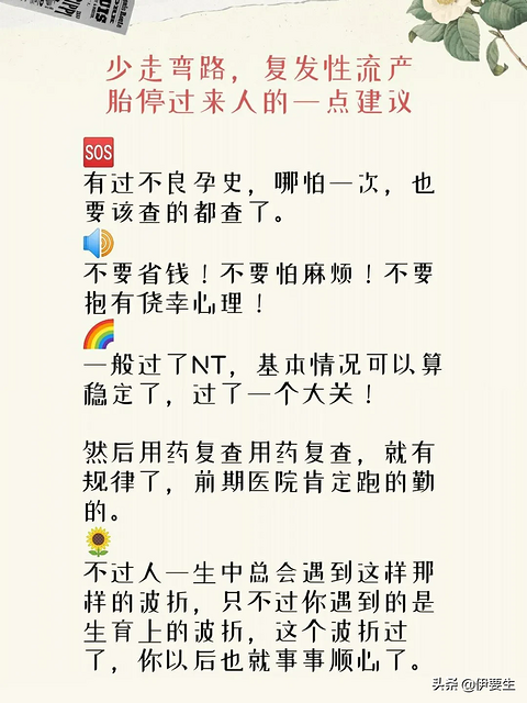 有过不良孕史,哪怕一次,也要该查的都查了。不要省钱!不要怕麻烦!不要抱有侥幸心理!一般过了NT,基本情况可以算稳定了,过了一个大关!然后用药复查用药复查,就有规律了,前期医院肯定跑的勤的。不过人一生中总会遇到这样那样的波折,只不过你遇到的是生育上的波折,这个波折过了,你以后也就事事顺心了。 转自伊要生
