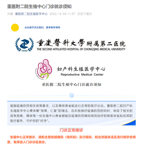 看到了顺手转一个。 重医附二院生殖中心门诊就诊须知根据疫情防控相关政策要求,以及确保患者能进行正常的医疗诊治。重医附二院妇产科生殖医学中心秉承着“宽厚,仁爱”的理念,在积极做好疫情防控的同时,制定了相关的应急预案,确保每一位生殖中心患者都能在疫情防控期间得到良好的就医体验和优质的医疗服务,守护您的“好孕”。 门诊正常接诊生殖中心正常接诊,请配合查验健康码(场所码)及行程码,配合测量体温及流行病学史