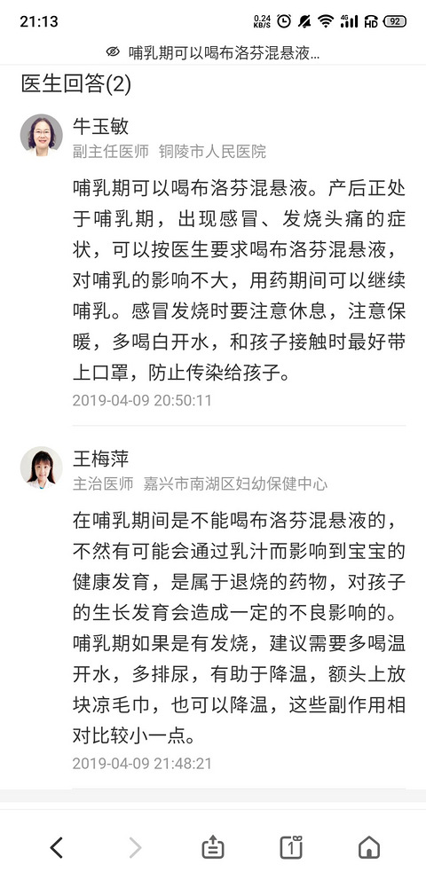 哺乳期妈妈着凉发烧,喝了5ml儿童布洛芬混悬液(含0.1g布洛芬),不知道如何喂奶了。百度看到了让人纠结的两种说法(见下图),各位大神怎么看呢?
