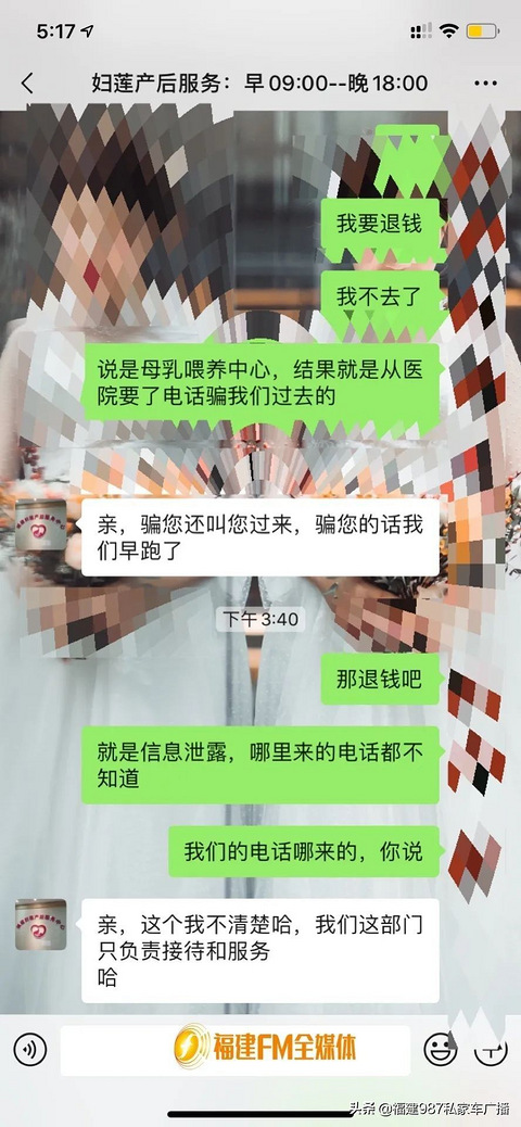 母乳喂养刚满月,就有人自称“母乳喂养中心”的工作人员上门催乳按摩,按摩结束之后,忽然提出要交钱办理套餐!近日,福州的林女士向FM全媒体《维权超给力》反映,她被一家叫做“妇莲”的公司给套路了。 林女士与“妇莲产后服务中心”工作人员聊天记录 福建987私家车广播