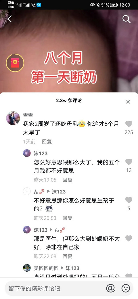 刚才刷抖音,一个妈妈说准备出去打工,要给八个月的孩子断母乳,孩子夜里哭的特别伤心,断奶失败了,引起了很多宝妈的共鸣,竟然有一个女的评论,怎么好意思喂到这么大?他觉得喂到五个月都挺不好意思的!大家都给她评论,问她有什么不好意思的?她说到处喂奶很不好意思,五个月以后就应该戒奶,或者偷偷摸摸喂奶。有的宝妈说孩子只吃母乳,不吃别的,她说都是给孩子惯的!饿几天就好了!她说光天化日喂奶,太丢人,她说见过很多