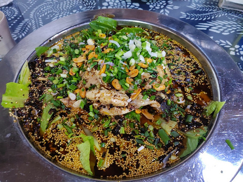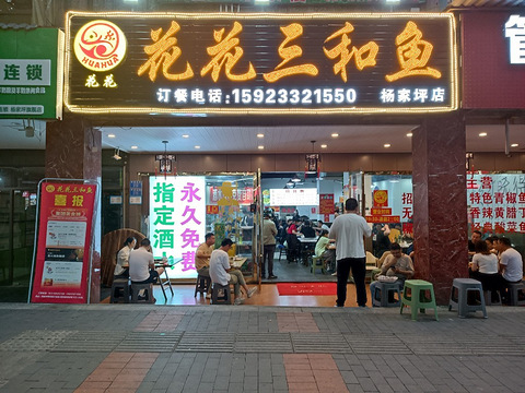 从杨家坪中学A区西郊路往下走,就是这家店了价格就在墙上的,部分酒水免费,国宾免费,乐宝1元,价格是相当实惠了上菜一般老板建议你一次性点足量,加菜就不是很入味了,这一锅有新鲜鱼头和娃,特别是粉,非常的劲道,加点醋,更是又麻又辣又酸的酸辣粉了蛙也是非常嫩滑入味,这个就是麻味比辣味稍重点的味道,喜欢吃麻的有口福了。点的菜吃得干干净净的,味道巴适得板!