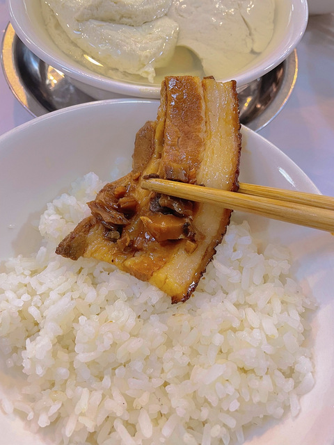 不晓得是不是有故乡情怀加持,反正每次回到綦江我就觉得饭菜都好好吃米饭是甄子饭炒儿菜 不软不硬豆花饭 豆花又嫩又棉扎烧白 肥瘦适宜,咸菜香惨了(我吃了四片)回重庆之前也是必须以一碗米粉结束