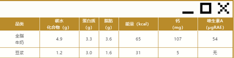 前面我们说了乳糖不耐受的人群也应该坚持摄入奶制品,很多人会疑问,为什么我不可以用豆浆来代替牛奶呀,豆浆和牛奶不是差不多吗?我们先来看看牛奶和豆浆的部分营养素对比。 从表格我们可以清楚的发现,和牛奶比较,豆浆的碳水化合物更低、脂肪含量更低,热量也更低,然而蛋白质含量相差不大。