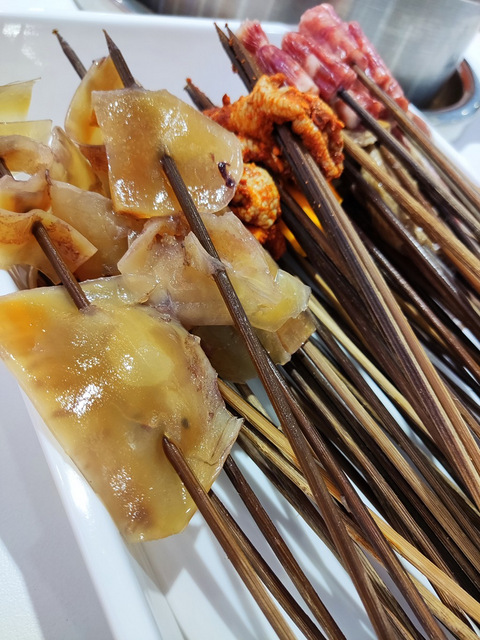 朋友拉我进优惠群,发现新大陆,一直在买买中,可是很少有机会去使用。昨天终于约上好友去消费烤肉卷。 调料盘,中外结合,辣椒面是贵州的,花椒是采购新疆的,组合起来确实比其他店的蘸料好吃。液体蘸料是贵州吃法,吃起来酸甜口,我不爱吃酸的都能接受,中间的蘸料在哪都能吃到,韩国口味。老板说肥牛是国外进口的,吃起来确实不错,特别新鲜,不是冻货,我们吃到后面加了一盘鸡皮,强烈推荐,吃起来糯糯的,像吃肥肠,新鲜可口