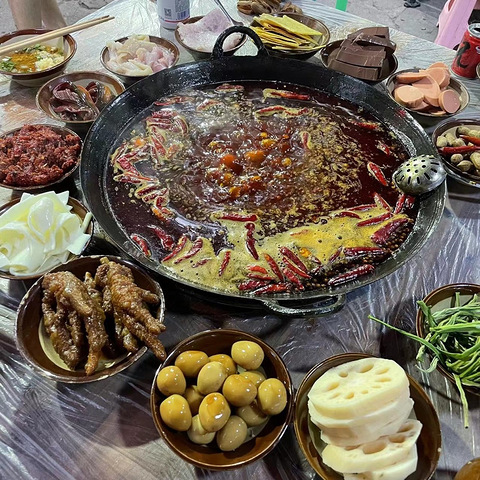昨天去朋友家玩,带我们去吃了一家装修时髦的串串店,我刚开始很抵触说这种店看起就是属于难吃的那种网红脸风格店。等锅底一段上来,我靠,好多牛油哦。闻起蛮香。各种菜品都很干净,发鱿鱼很多片穿一串好评。特色菜那个猪舌好吃,脆脆的,其他店没吃到过。还有一个就是广味香肠,很多串串店的甜肠哈喉,臭,这家品质真的不错。还有9.9半斤的卤猪蹄,真的推荐大家去吃。蛋炒饭也可以,娃儿吃了一大碗。哈哈哈哈哈。地址在大龙山