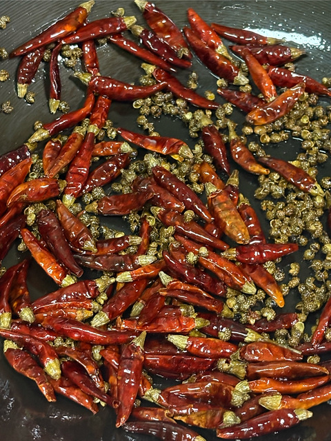 第一步,把辣椒花椒放一起炒,少量油,防止炒糊