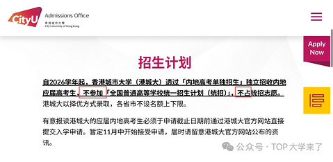 9月20日,根据香港城市大学发布的内地应届高考招生计划显示,自2026学年起,香港城市大学(港城大)透过“内地高考单独招生”独立招收内地应届高考生,不参加“全国普通高等学校统一招生计划(统招)”,不占统招志愿。港城大以择优方式录取,各省市不设名额上下限。有意报读港城大的应届内地高考生必须于申请截止日期前通过港城大官方网站直接提交入学申请。暂定11月中开始接受申请,届时请留意港城大官方网站公布的资讯