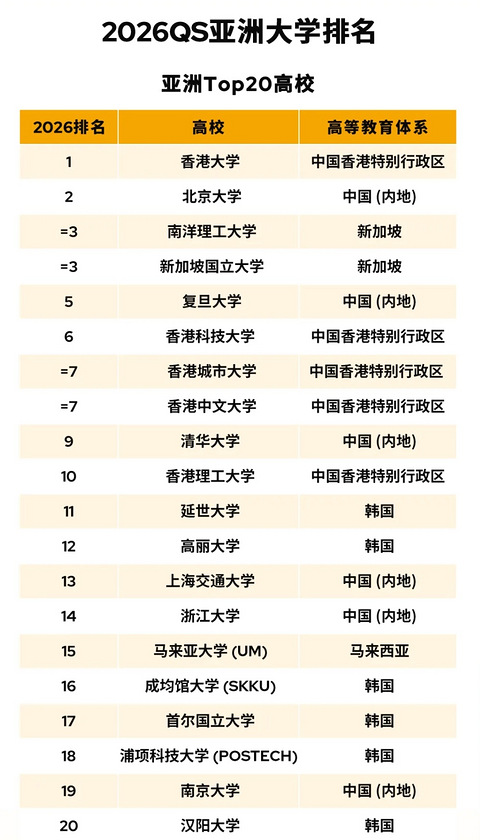国际高等教育研究机构QS Quacquarelli Symonds发布了2026亚洲大学排名(QS University Rankings Asia 2026)本次排名涵盖亚洲地区25个高等教育体系的1529所院校,其中558所为首次上榜。香港大学荣登亚洲榜首,北京大学位居第二。新加坡南洋理工大学(NTU)上升一位,与新加坡国立大学(NUS)并列第三。
