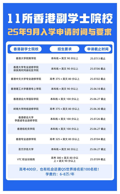 11所香港副学士院校,25年9月入学申请时间与要求。