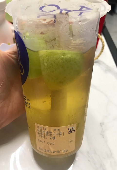 老盐柠檬,刚吸到嘴那一刻,就打yue了,又咸又甜,充斥着柠檬反复冲泡的皮子泡胀的一股味道,不清爽反倒很油腻,yue了yue了