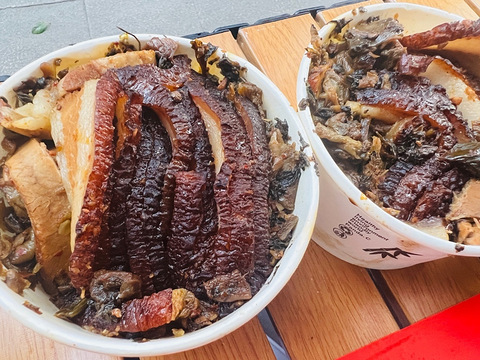 听朋友说他们那边有家摆摊的烧白很好吃,昨天专门坐5号线去买来试了一下,确实不错!它的盐菜是老盐菜,不是芽菜,就像小时候的味道,买回来平时不爱吃肉的饭渣娃居然吃了一大碗,盐才下饭,谁懂啊,停不下来!