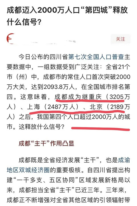 成都人口突破2,100万,新增25万,开始紧追重庆!