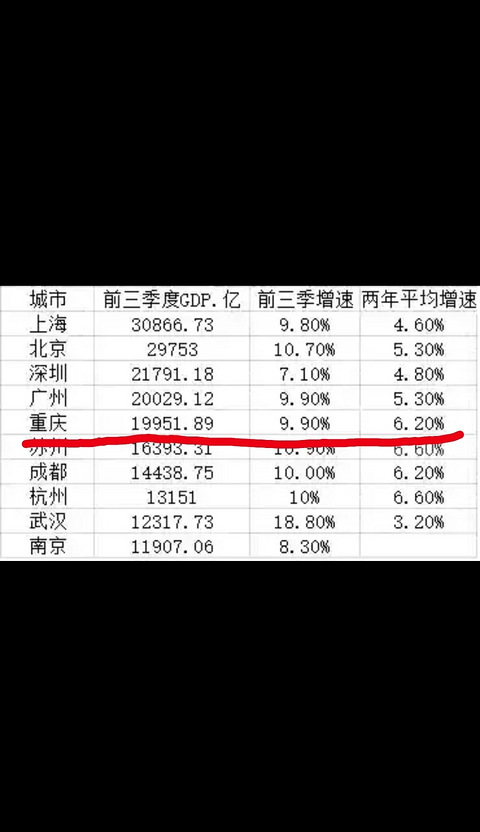 GDP10强城市三季度报,原来重庆已经这么优秀了。 GDP前三季度十强城市名单已经愉快的出炉了,有4个城市超过了2万亿。 没想到的是重庆已经悄悄的这么优秀了,他的前三季度GDP将近20,000亿,增速9.9%。 你知道这意味着什么吗?意味着除了我国的4个一线城市以外,重庆就是最亮眼的那颗星。 看来重庆这些年真的发生了翻天覆地的变化,整个城市的面貌完全不一样了,我相信未来会越来越好。