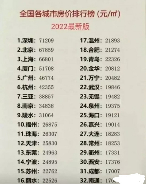 【全国各城房价排行榜来了,重庆白菜价未上榜?】 你知道我国哪个城市的房价最贵吗?你知道我国各个城市的房价排名吗?你在的城市房价表现到底贵还是不贵呢? 那我们就来看一看全国各城市房价排行榜: 深圳最高,陵水高于福州,衢州高于西安全国房价最高的城市依然是深圳,高达每平米7.12万元。 深圳每年都能吸引很多大学毕业生,经济活力很强。 陵水因为长夏无冬的气候,很多东北人来此买房,房价比省会城市福州都贵。