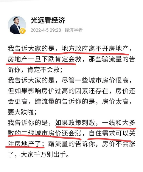 【马光远:地方政府离不开房地产,房地产一定要救!】 最近啊,我们都在关注著名经济学家马光远先生关于房地产的言论,我们都知道他一直都是看涨的,一如既往的如此。 但是前两天也不知道怎么回事,话风一转说未来的房价一定会下跌,让大家等于在未来有很多捡漏的机会,想买多少套便宜的房子就买多少套。 然后现在又说:地方政府离不开房地产,房地产一旦下跌肯定会救! ?不过他的话也说得很明确了,一旦开始就是一旦开始刺激
