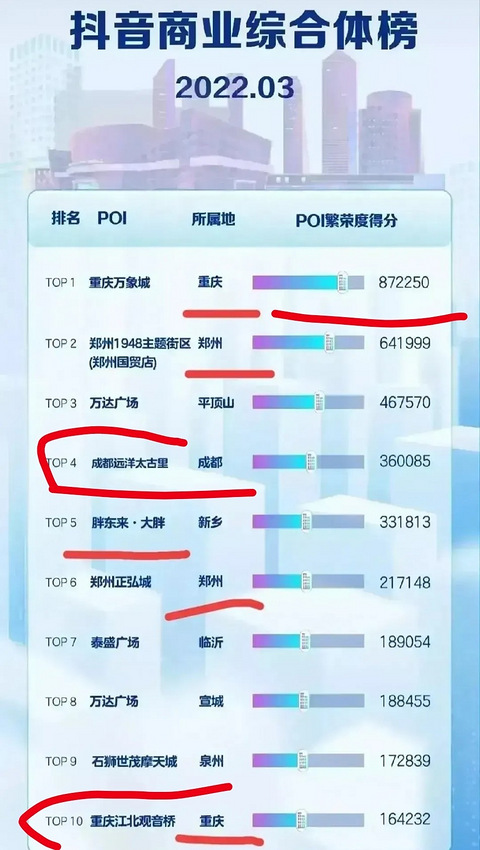 厉害了,重庆万象城!第一?轻松吊打成都太古里! 重庆也太棒了吧,根据抖音商业综合榜排名来看,北上广深都无缘前十,重庆万象城却未居榜首。 而且这一次重庆的万象城真的是轻轻松松的吊打成都的太古里呀。 被网友们吹得像神一样的成都太古里,看来也平平无奇嘛,还是一般般嘛。 不过话又说回来,为什么观音桥还没能排到第一呢?难道现在重庆人的商业逻辑和思维都变了吗? 看来是很多重庆的品牌奢侈品都集中在了万象城吧。