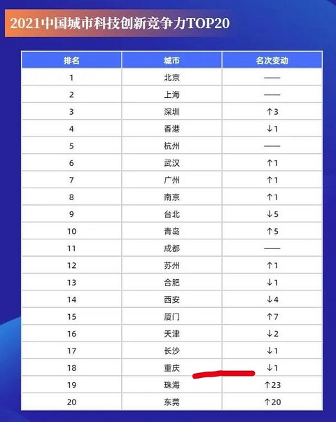 重庆到底怎么了?科技创新竞争力排名这么落后。 真的是无言以对呀,真的是无语了,为什么2021年科技创新竞争力排名前20强,重庆排名这么落后? 我承认一个城市能够挤进前20强已经非常的不错了,但是在这20个城市里面重新排名的确是落后的呀,基本上都是倒数。 重庆不仅排在了18名,也就是倒数第3名,而且和2020年相比又下滑了一名,这到底是怎么了?
