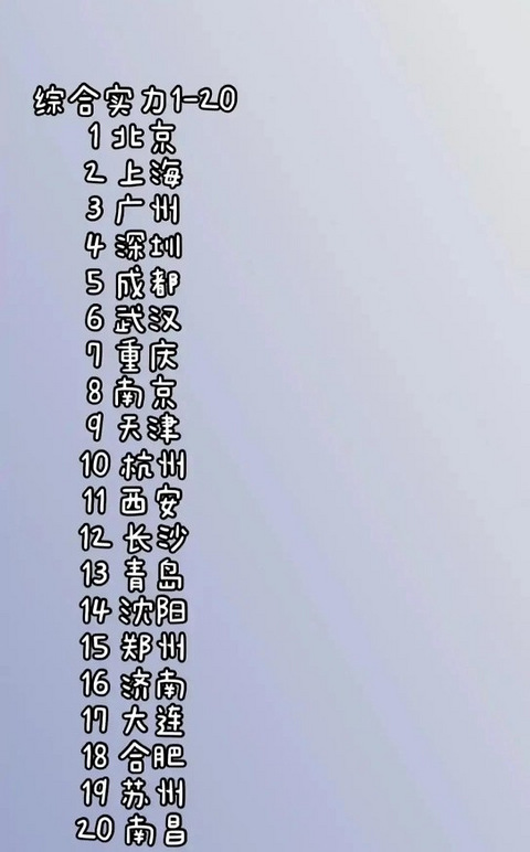 【综合实力20强,重庆只能排第七,你喝醉了吗?】 最近看到一些网友在对我国前20强城市进行综合实力的排名看了之后,其实大部分我是认同的,但是对于重庆我觉得你是不是喝醉了呀? 成都处于第5,沈阳力压郑州处于第14,苏州竟然第19,这不是瞎扯淡吗? 北上广深四大一线城市处于前4,这倒是没有任何争议的,关键是成都处于5,力压武汉、重庆还说得过去? 说实话,把南京、杭州放在后面有些过了,重庆完全可以排到第