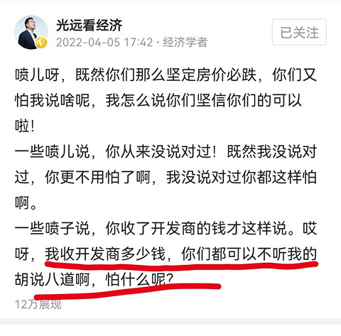 【著名经济学家马光远说:喷儿呀,你们不要害怕房价下跌!】 最近啊著名的经济学家马光远又火了,去年他的火是因为他说重庆的房价会领跑全国涨幅第一,结果真的灵验了。 而今年是他说房价要大跌,叫大家不要买房,因为未来有很多捡漏的机会,想买多少套就买多少套,很多炒房客会排着队站在高台上跳。 然后又告诉大家喷儿呀,你们不要害怕房价下跌,因为他没有说对,所以说你们的希望会泡汤。 即便是他收了开发商的钱,也不关你