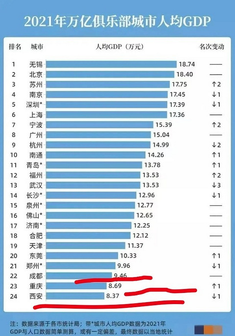 重庆倒数第二,西部三强垫底? 这到底是怎么了? 2021年GDP超过万亿的城市一共有24个,然而看上去很强,但有的城市人均GDP却非常的弱。 在这24个城市当中,西安的人均GDP倒数第一,仅仅只有8.37万元。 而重庆的人均GDP也不是特别的多,仅仅只有8.69万元,多了那么一点点。 成都也好不到哪里去,看来他这一次炸锅不起来了,因为他是倒数第3,人均GDP仅仅只有9.46万元,都还没有突破10万