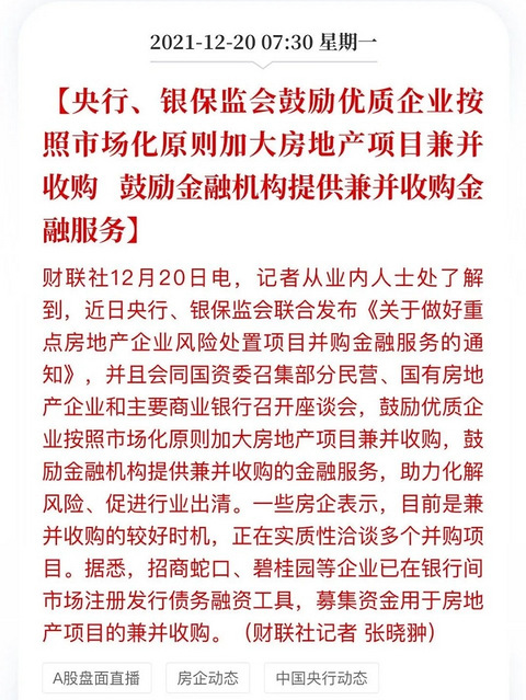 央行、银保监会鼓励优质企业加大房地产项目兼并收购!