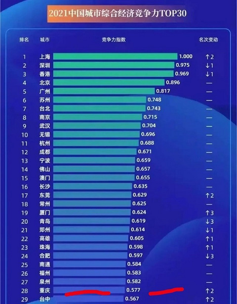 2021年中国城市竞争力,香港深圳下滑,重庆这么落后?