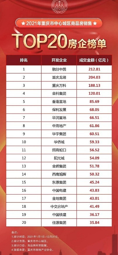 【原来在重庆这些房子最好卖,你买了吗】 在重庆买房我们不仅仅是为了考虑自己的居住,而且是为了投资,那么投资就要考虑两个问题,一个是有性价比,一个是在市场的流动性较好,能够快速的变现。 那你知道在2021年哪些房子在重庆楼市里面最受欢迎,最好卖吗? 据了解,2021重庆中心城区商品房销售TOP20房企榜单来袭: 第一名:融创中国 212.81 亿元。第二名: 重庆龙湖 204.03 亿元。第三名:重