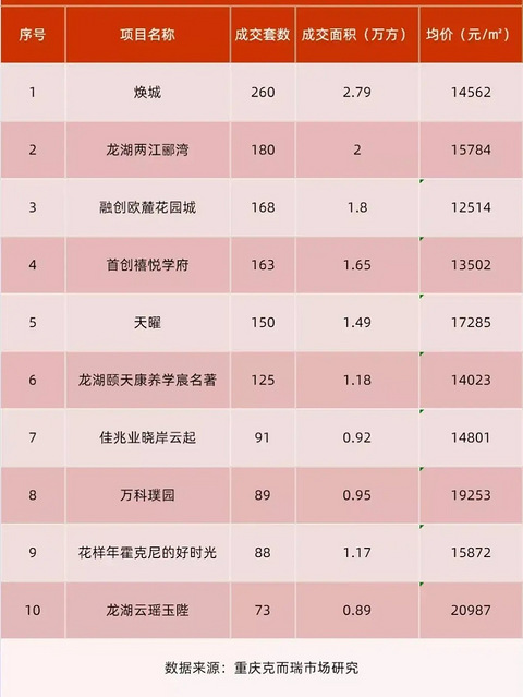 【2022年1月,重庆住宅成交排名,你买对房了吗?】 时间过得真快,2022年1月重庆主城住宅成交TOP10已经出炉了。 据了解,2022年1月重庆新房月度成交榜中: 焕城以260套成交数、2.79万方成交面积位居榜首;龙湖两江郦湾以180套成交数,2万方成交面积位列第二;融创欧麓花园城icon以168套成交数,1.8万方成交面积排名第三。 难不成只有这些房子才最受欢迎,买房投资是不是也要看谁成交