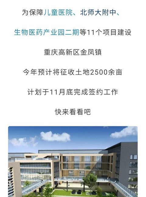 科学城 | 项目建设再提速!多个项目土地征收工作有序推进。 看样子重庆接下来的十年,真的要重点的打造西部科学城了。 从这样的角度来看,北区真的是有压力了,有了齐头并进的兄弟,有了竞争的兄弟,作为买房者就有了不同方向的选择,可以选择去的科学城,也可以选择北区。 很明显,为保障儿童医院、北师大附中、 生物医药产业园二期等11个项目建设 重庆高新区金凤镇,今年预计将征收土地2500余亩,计划于11月底完
