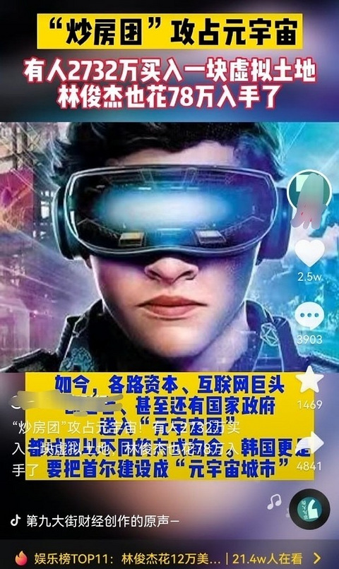【炒房团开始攻占元宇宙,都不看好楼市了吗?】 最近看到一个非常震撼的新闻,和当下非常火热的元宇宙息息相关。 说是炒房团开始攻占元宇宙,真的是太疯狂了,有人花了2,732万元买了一块虚拟土地,就连歌手林俊杰也花了78万元入手。 现在各路资本,互联网巨头等,都开始进入元宇宙,这到底是好事还是坏事呢?