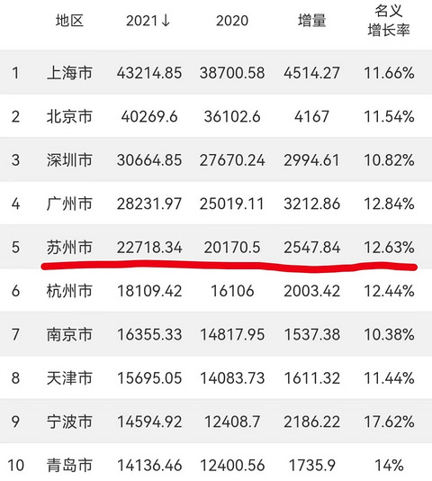 【2021年东部地区GDP10强,杭州碾压南京,重庆未上榜?】 时间过得太快了,2021年我国的GDP排名已经出炉了,今天我们来看一看2021年东部地区GDP前10强排名到底如何? 从排名来看苏州排在了第五,不仅碾压了南京,而且增量达到了2547.84,一整年增长了12.63%表现非常亮眼。 奇怪的是青岛这一次垫底了,排在前4名的仍然是我国的四大一线城市,这个无可非议。 然而GDP总量一直排在我国