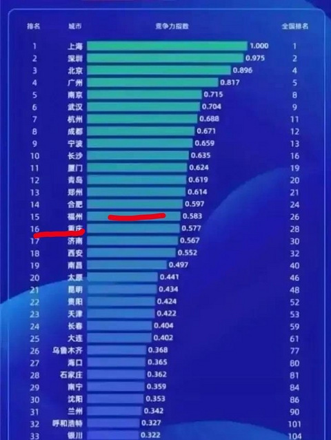 【重庆被福州碾压?深圳紧追上海,是不是真的哟!】 你知道我国主要城市的综合竞争力指数排名吗? 这一次排名真的是让我大跌眼镜,福州把重庆给碾压了,深圳而且紧追了上海,这是野鸡榜吗? 你看看,南京第五,武汉力压杭州,青岛领先郑州,哈尔滨垫底,成都以及天津的真正实力应该远远不止于此吧? 而且目测一下重庆的实力远不如此啊,发展那么快,是一个国际化的大都市,这是哪来的野鸡榜啊?你们觉得呢?