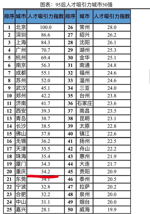 2021年95后人才吸引力城市50强,重庆掉队了吗?