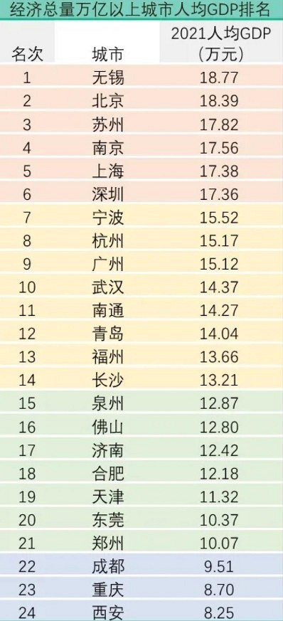 【24座万亿GDP城市,人均GDP居然它最高?】 我们都知道,我国一共有24座城市,GDP突破了万亿元, GDP总量排名我们已经非常明确,那么人均GDP排名又是谁最高呢? 因此,在24座万亿GDP城市里面,人均GDP谁高呢? 据了解,无锡的人均GDP在这24座城市里面是最高的,高达18.77万元,其次是北京,也有18.39万元,苏州排在第三,人均GDP是17.82万元。人均GDP高于17万的城市还