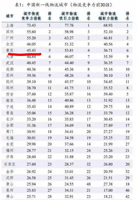 【重庆太牛了!晋升为我国新一线物流城市,房价会涨吗?】 一直以来都有很多朋友不看好重庆的发展,总觉得重庆是一座比较平常的城市,工资收入非常的低,房价不可能大幅上涨。 但是你知道吗?重庆这些年发展真的太快了,已经晋升为了我国新一线物流城市,真的太牛了。 据了解,在我国30座物流城市当中,重庆排名第五,实力碾压了很多的城市。 说实话,我一直强调,我国物流第五城就是重庆,这里的城市物流吸引力指数和城市物