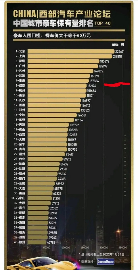 真没想到,原来苏州和武汉也这么多豪车。 有人说一个城市的豪车数量也体现了一个城市的有钱人数量,有钱人的数量越多,那么就会支撑着房价的上涨,因为有钱人才买得起房。 其实想想也是这么回事,那些买不起房的根本就不可能成为楼市里面的购买力,所以他们抱怨房价便宜也好,贵也好,其实都不重要。 大家快来看一看我们城市的豪车排名,真的是万万没有想到,苏州和武汉的豪车居然这么多。 不过话又说回来,重庆也不错,仅仅是