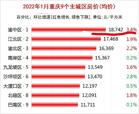 【2022年1月份,重庆房价涨跌排名,你家房子涨了吗?】 2022年1月重庆市9个主城区房价(挂牌价均价)排名: 1、渝中区, 18,742 元/平方米 2、江北区, 17,468 元/平方米 3、渝北区, 16,369 元/平方米 4、南岸区, 15,367 元/平方米 5、九龙坡区, 13,549 元/平方米 6、沙坪坝区, 13,470 元/平方米 7、大渡口区, 12,197 元/平方米