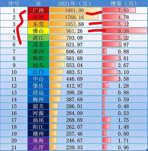 2021年珠三角人口红利渐渐消失,深圳都扛不住了。 人往高处走,水往低处流的说法似乎要变一变的,因为2021年珠三角的人口红利都逐渐消失了,连深圳的人口增量都已经不显眼了。 2021年深圳人口增量4.78万,东莞增量5.32万,广州增量7.03万,惠州算是增量最少的吧,大概只有0.88万。 不过深圳的常住人口还是蛮多的,1800多万,广州也不错,1700多万,东莞1000多万。 这三个城市应该算是