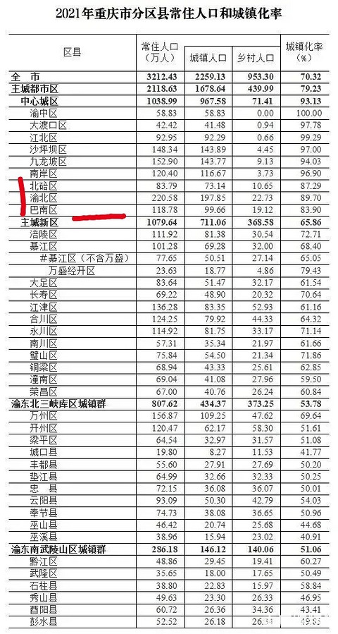 太意外了!重庆中心城区农村人口和城镇化数据有惊喜! 从2021年开始,重庆就没有主城区区县之说的,改为了中心城区+区县。 我们来看一下重庆中心城区农村人口和城镇化率数据有什么重大变化,这真的会很影响你买房哦。 你有没有发现重庆有三个中心城区,城镇化率居然不90%。 它们分别是是:渝北区、北碚区、巴南区。 1. 渝北区,住人口220.58万人,城镇人口197.85万人,农村人口22.73万人,城镇化