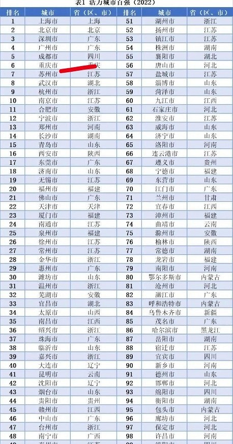 重庆真的太强大了,这一次排在了第6名! 2022年我国城市活力100强的名单当中,重庆排名是靠前的,排在了第6名,非常亮眼。 只不过在我看来,不管从夜间经济商业魅力还是GDP,还是其他的方方面面因素来看,我怎么认为重庆应该排在第1名。