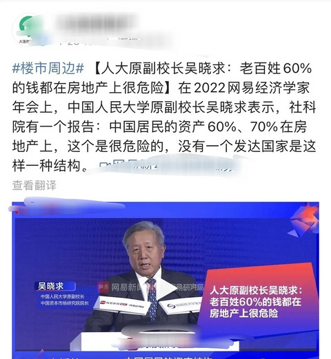【有多少人还是期待房价大跌,看看这个你就明白了!】 我知道楼市进入了新周期,很多人都不看好房地产市场,他们都觉得呀未来的房价一定会大跌,一定会像白菜一样非常便宜。 其实你真的错了,我也一再强调,但就是没人相信,因为很多人很少从本质的方向去思考这个问题。 这一次,吴晓求icon说得很明白了: 他表示,老百姓60%的资产在房产上面,房价大跌,老百姓几十年幸幸苦苦的劳动所得将大幅度缩水,这谁都不能接受。