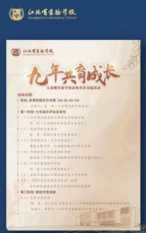 官宣来了4月25日江北教育及华龙网报道,今年9月江北嘴实验学校将开办七年级,最重要的是,将与鲁能巴蜀中学共建友好发展学校! 注意重点传达信息: 1.江北嘴实验学校成为九年一贯制学校,今年9月合作以后开始有7年级(初一年级); 2.两校将建立教师引领培养机制,课程资源共享,教育教学教研一体化合力发展