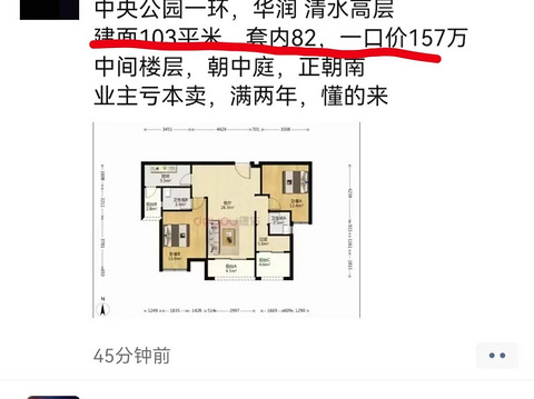 【终于还是下跌了,重庆的二手房扛不住了吗?】 重庆楼市真的是变化太快了,真的是太模范了,涨得不多,涨得不久,跌得却反而时间更长。 有网友说,重庆的二手房顶不住了,之前炒的火热的中央公园建面只要一万五了。 一套建筑面积108平米的房子,总价居然只要157万,说实话这真的是大跌眼镜啊。 想当初都是两万以上的,像这种房子随随便便都是200万起步,有的甚至卖到了300万出头。 这不一下子就跌了那么大几十万