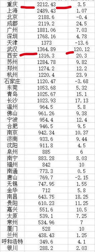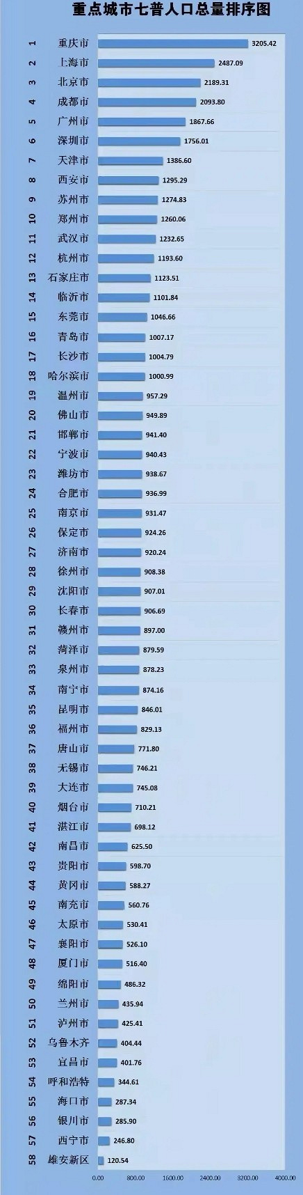 【重庆太牛了,全国7次人口普查,人口居然最多?】 重点城市七普人口总排序出炉了,重庆真的太亮眼了。 重庆不但大,人也最多,3,205万人次,成都表现也不错,前十名中成都今年还入选了超大城市。 哈尔滨1000万人口很坚挺,临沂比省会人还多,北方总体还有所减少。 俗话说人多就是力量,有人的地方就有更活跃的经济城市,发展会更快,房价的增长空间也会更大,因为购房的需求会被释放。 也不知道重庆这么多人房价会