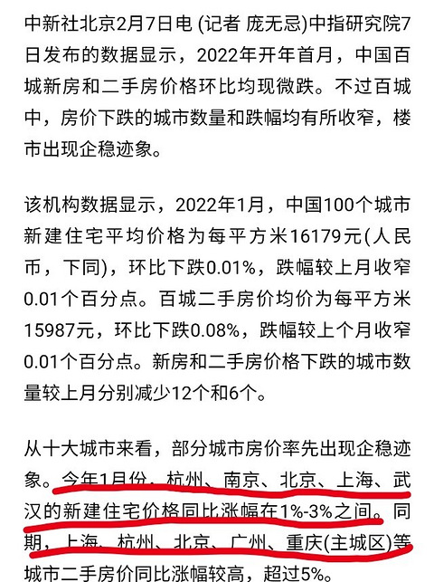 【2022百城房价下跌,只有这几个城市才会上涨?】 熟话说,一年之计在于春,2022年城市的房价表现如何,就要看月初年初到底表现怎么样了? 据了解,2022年首月中国百城房价微跌,京杭等城市或率先企稳,重庆等城市价格上涨,涨幅超过5%,表现比较亮眼。 目前房价还在上涨的城市,有杭州,南京,北京,上海,武汉,涨幅达到了1%~3%之间。 上海,杭州,北京,广州,重庆主城区也在上涨,涨幅比较高,超过了5